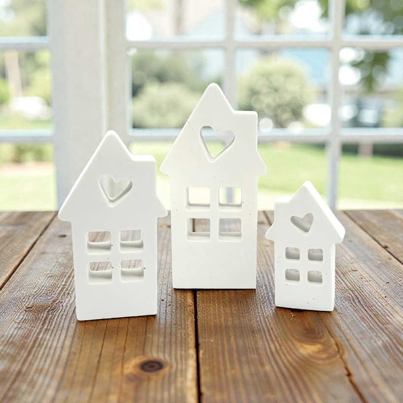 Gi hjemmet ditt et unikt og stemningsfullt inntrykk med dette dekorative settet bestående av tre sjarmerende hus. Hver husfigur er håndlaget med sans for detaljer, og har utskårne vinduer og et hjerteformet motiv i toppen som tilfører et varmt og innbydende preg.