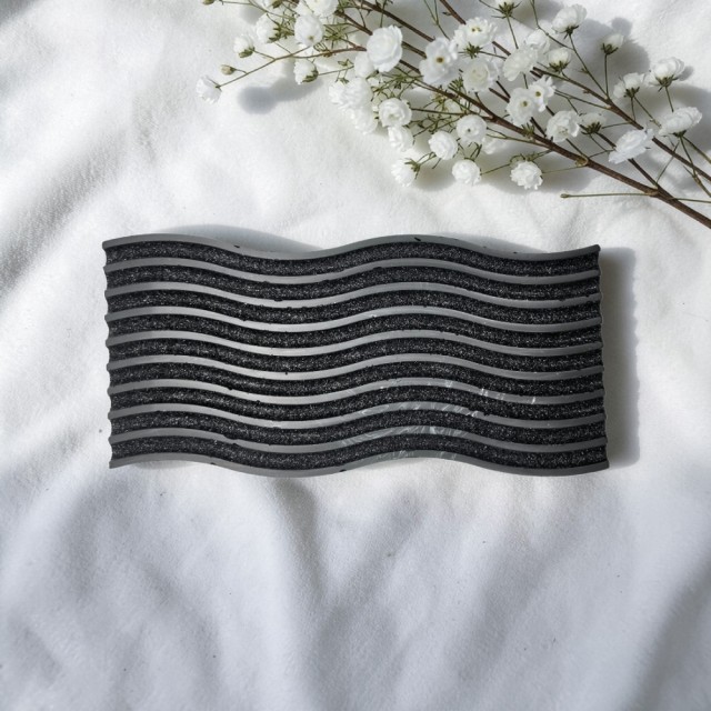 Dette store dekorfatet kombinerer kontrasten mellom sort og hvitt med en elegant bølgeform som skaper et levende og moderne uttrykk. De glitrende detaljene følger bølgene og gir et subtilt shimmer som fanger lyset fra ulike vinkler, og gjør fatet til et naturlig blikkfang i rommet.