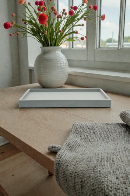 Dette lille rektangulære fatet i myk gråtone har et rent, minimalistisk uttrykk som passer perfekt inn i moderne og nordiske hjem. Den lave kanten gir et ryddig og elegant preg, samtidig som fatet er praktisk til både dekor og organisering.