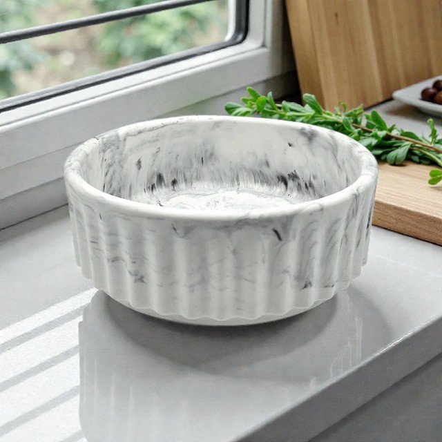 Disse store marmorskålene kombinerer moderne design med et luksuriøst uttrykk. Med sitt riflete mønster og elegante marmorlook, fremstår de både tidløse og sofistikerte. Hver skål er unik – de naturlige åremønstrene i marmorfinishen gir et eksklusivt preg som gjør at ingen blir helt like.