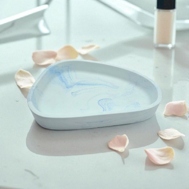 Dette unike fatet kombinerer minimalistisk design med et delikat marmormønster i lyse blå toner. Den organiske trekantformen gir et moderne uttrykk som skiller seg ut fra vanlige runde eller firkantede fat.