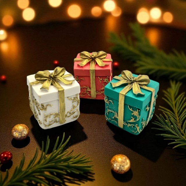 Tilgjengelig i et stort utvalg av farger - velg de fargene DU elsker! Disse dekorative pakkene er formet som små gaver med detaljerte relieffmønstre og elegante bånd, som gir et luksuriøst og festlig preg til hjemmet ditt.