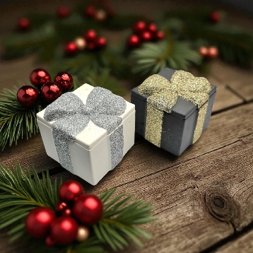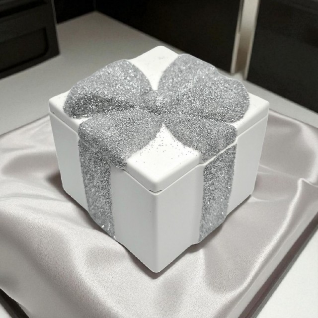 Disse elegante gavekrukkene er utformet som små gaver med glitrende sløyfedekor på lokket. De finnes i sort med gullglitter eller hvit med sølvglitter, og kombinerer et moderne design med et festlig preg som passer perfekt til jul og andre anledninger.
