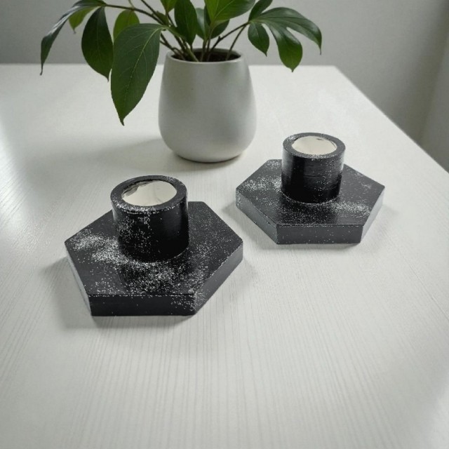 Disse stilrene lysestakene kombinerer et moderne, geometrisk uttrykk med en sofistikert glans. Den hexagonformede basen gir et eksklusivt og arkitektonisk preg, mens den sorte overflaten med glitter effekt tilfører et luksuriøst uttrykk. Perfekt til både hverdag og fest, og en nydelig detalj på spisebordet, i stuen eller som en del av en dekorativ oppbekning.