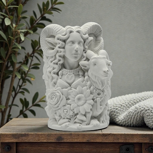 Denne dekorative figuren er et kunstnerisk statement som forener det feminine og det symbolske i en harmonisk form. Med detaljerte horn, myke ansiktstrekk og rike ornamenter av blomster og teksturer, utstråler figuren både styrke, ro og mystikk. Den symboliserer også stjernetegnet ''Væren''.