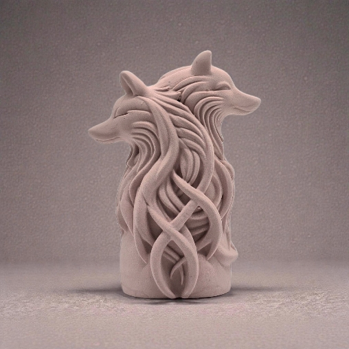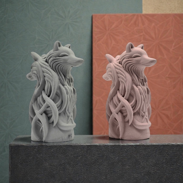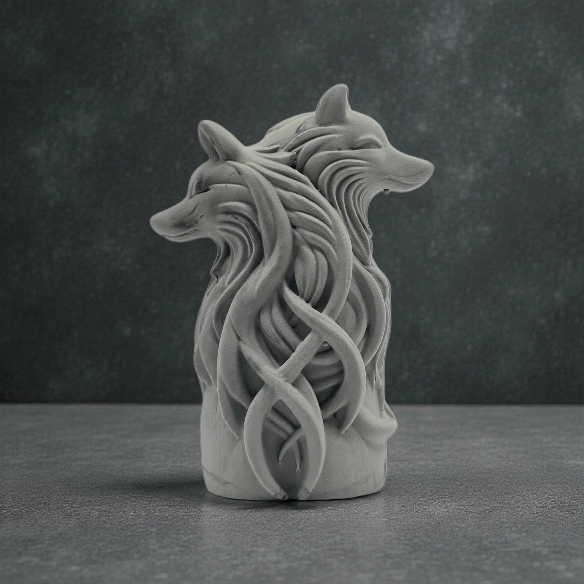 Denne dekorative ulvefiguren kombinerer styrke og eleganse i et skulpturelt uttrykk inspirert av naturens ro og kraft. De to ulvehodene som vender hver sin vei skaper en symbolsk balanse - som voktere av både fortid og fremtid - mens de flytende linjene gir figuren et levende og kunstnerisk preg.