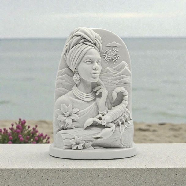 Denne dekorative figuren er inspirert av stjernetegnet Skorpionen, et symbol på styrke, intuisjon og transformasjon. Den elegante kvinnen fremstilles i rolig balanse med skorpionen, omgitt av natur og landskap som gir figuren følelse av mystikk og dybde. De fine detaljene i ansiktet, smykkene og omgivelsene skaper et kunstnerisk uttrykk som gjør figuren til et unikt blikkfang.