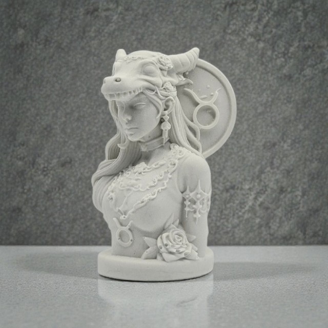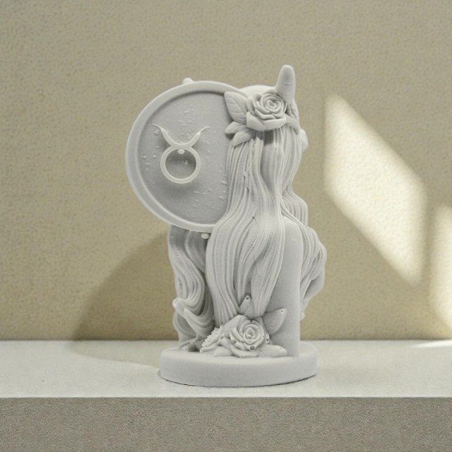 Denne dekorative figuren er inspirert av stjernetegnet Tyren, et symbol på styrke, stabilitet og jordnær eleganse. Figuren fremstiller en rolig og kraftfull kvinneskikkelse kronet med horn, omgitt av detaljer som fremhever natur, sensualitet og indre styrke. De fine ornamentene og de myke linjene gir skulpturen et harmonisk og kunstnerisk uttrykk.