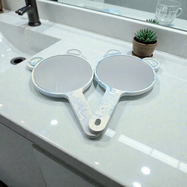 Dette elegante håndspeilet kombinerer funksjon og design i et rent, moderne uttrykk. Den runde speilflaten gir klart speilbilde (beskyttet med film som tas av før første bruk), mens det marmorerte utseende tilfører et eksklusivt og lett lekent preg. Praktiske opphengdetaljer gjør speilet enkelt å henge opp, samtidig som det er perfekt å ha liggende fremme som en del av interiøret på bad eller sminkebord.