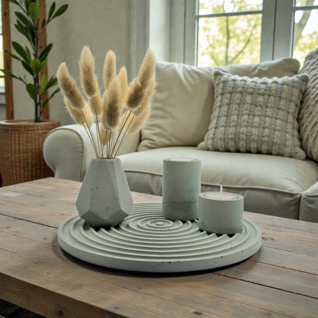 Dette gavesettet er håndlaget i betong og ikke den vanlige støpemassen som Homebeauty pleier å bruke. Her får du et helt unikt sett i rustikk grønn farge. Settet inkluderer et dekorativt rundt fat med sirkelstruktur, to minimalistiske lysholdere og en fasettert vase - nøye utformet for å skape en balansert og jordnær helhet.
