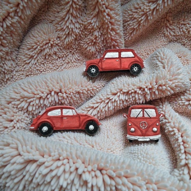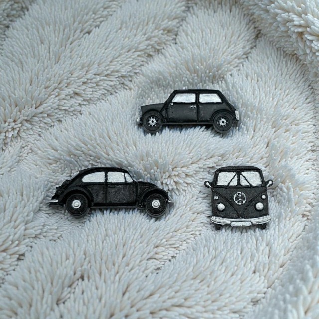 Gjør kjøkkenet ditt livligere med disse stilige håndmalte kjøleskapsmagnetene, inspirert av ikoniske bilmodeller. Settet består av tre biler - i svart, rød eller blå med sølv detaljer. Disse magnetene kombinerer retro sjarm med praktisk funksjon, og passer perfekt til kjøleskapet eller andre magnetiske overflater.. Perfekt gaveide for bilentusiaster og retroelskere.