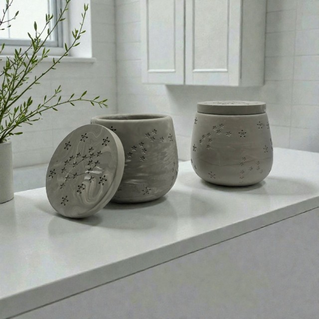 Denne limited edition krukken med lokk er et elegant møte mellom funksjon og kunsthåndverk. Den myke, steinaktige finishen kombineres med delikate, stjerneformede utskjæringer som gir krukken et poetisk og lett uttrykk.