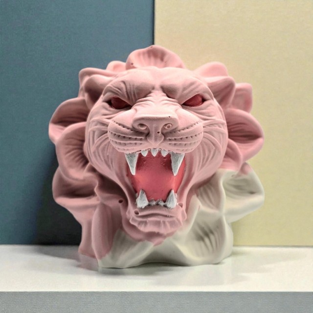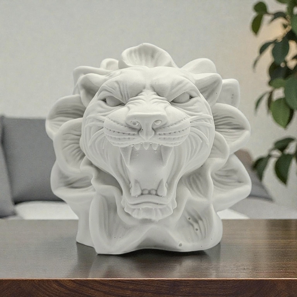 Denne dekorative tiger figuren er et dristig statement-piece som utstråler kraft, energi og attitude. Med åpent gap, markerte trekk og en blomsterinspirert ramme rundt hodet får figuren et unikt uttrykk som balanserer det rå og det kunstneriske - perfekt for deg som liker interiør med karakter.