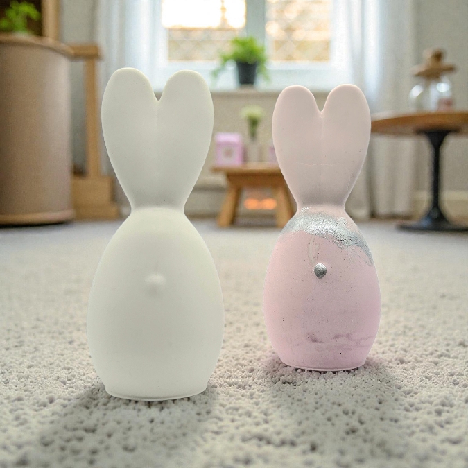 Figuren er laget i matt, hvit solid materiale og passer like godt som et diskret blikkfang i stua, barnerommet, på kontoret eller som del av påskedekorasjonen. Den rosa varianten har deilige rosa toner og skinnende sølv detaljer. Den tidløse formen gjør den enkel å kombinere med annen interiør - og den får alltid et smil frem.