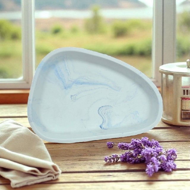 Dette unike fatet kombinerer minimalistisk design med et delikat marmormønster i lyse blå toner. Den organiske trekantformen gir et moderne uttrykk som skiller seg ut fra vanlige runde eller firkantede fat.