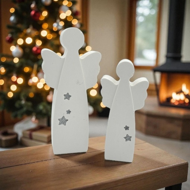 Skap en varm og fredelig julstemning med disse elegante englefigurene i hvit design med glitrende detaljer. Figurene har en stilren form med vinger og dekorative stjerner i sølvglitter eller gullglitter som gir et diskret, men luksuriøst preg. Perfekte å plassere på peishylla, spisebordet eller som en del av et dekorativt lysfat.
