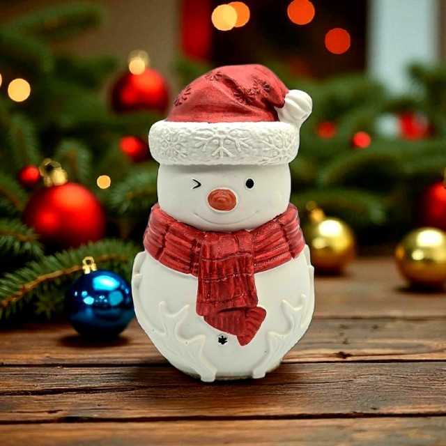Denne lille snømannen sprer både glede og julestemning med sitt lekne uttrykk. Med rød nisselue, varmt skjerf og et sjarmerende blunk, blir den et herlig innslag i hjemmets juledekorasjoner. Den kompakte størrelsen gjør den enkel å plassere på bord, i vinduskarmen, på peishylla eller sammen med lys på lysfatet.