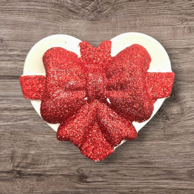 Disse sjarmerende små dekorasjonene er formet som gaver med en glitrende rød sløyfe som gir et festlig preg. Hver dekorasjon har en elegant hvit base som skaper kontrast til den dype røde glitterdetaljen. De finnes i både firkantet og hjerteformet variant, noe som gjør dem perfekte å kombinere sammen - men er like fin alene.