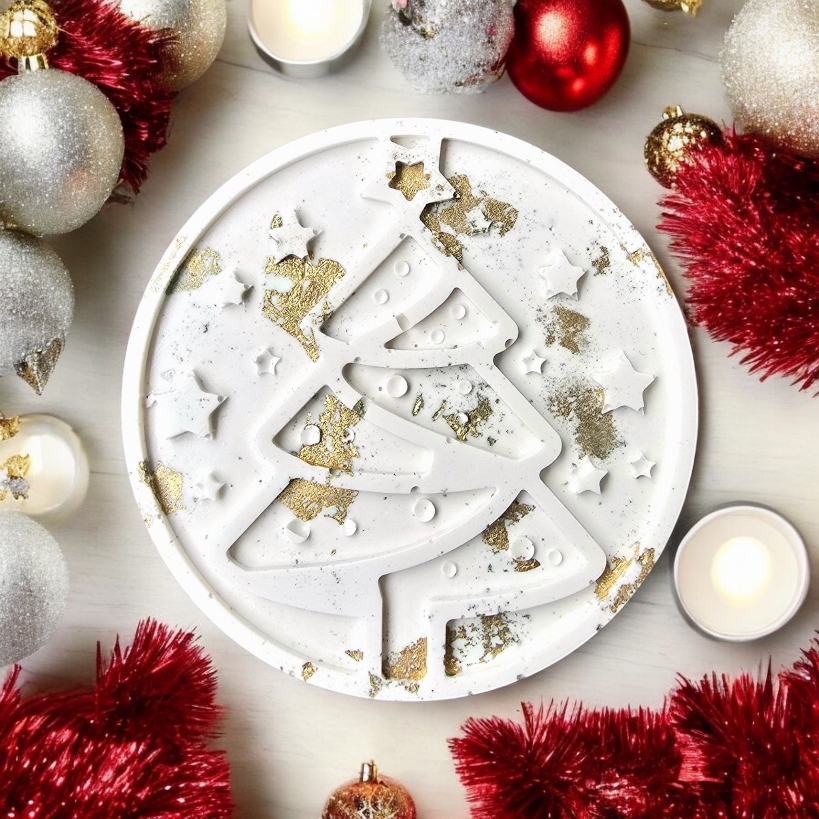 Skap ekte julestemning på bordet med disse unike glassbrikkene formet med juletremotiv. Hver brikke er dekorert med gullflak og små stjerner som gir et eksklusivt og festlig preg. Perfekte til både hverdagens kaffekopp i desember eller til selskap og julemiddager hvor detaljene teller.