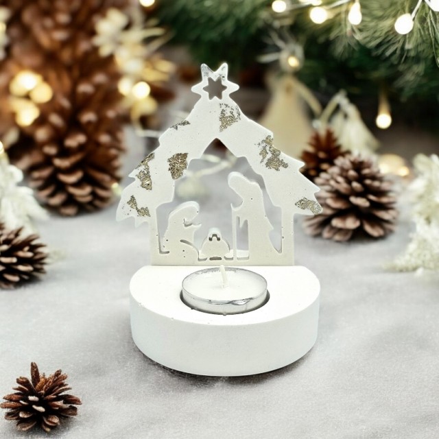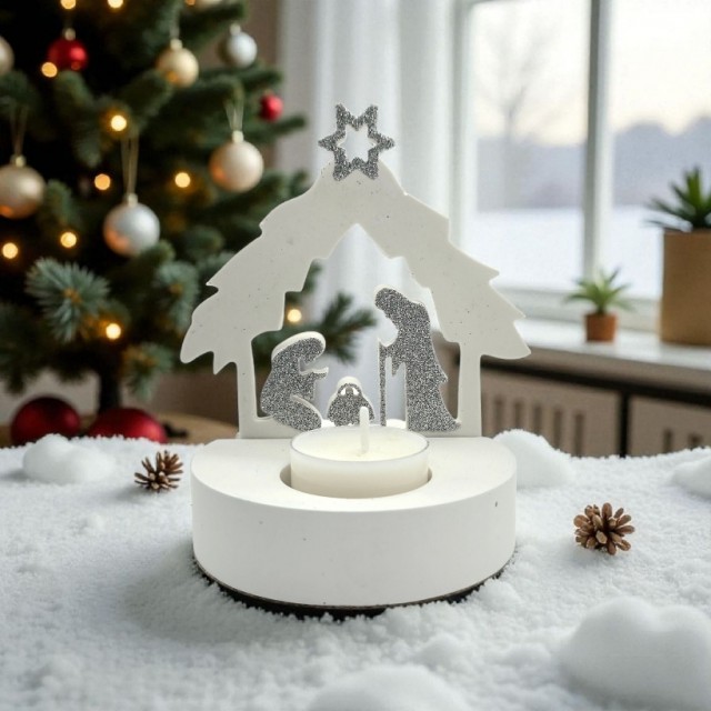 Denne unike lysholderen kombinerer vakker juledekor med den klassiske fremstillingen av julekrybben. Når lyset tennes, kaster glammes et varmt skinn over motivet og gir en stemningsfull påminnelse om julens budskap. Perfekt som bordpynt, på peisfylla eller i vinduet, der den vil spre både ro og høytidsglede.