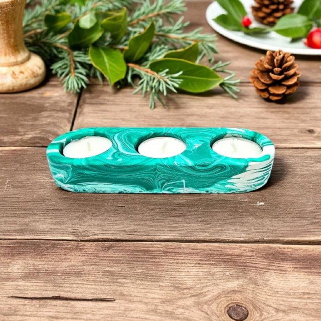 Denne elegante telysholderen med plass til tre lys er laget i et unikt marmormønstret design som skaper en dekorativ og stemningsfull effekt. Velg mellom rød/hvit som minner om klassiske julesukkertøy, eller grønn/hvit som gir et friskt og naturinspirert uttrykk. Begge variantene reflekterer lyset vakkert og blir et naturlig blikkfang i rommet.