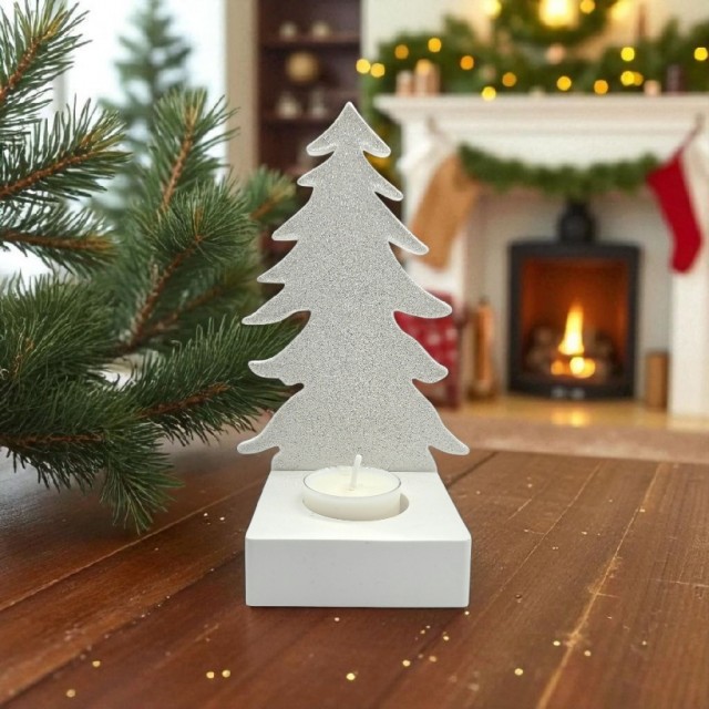 Denne dekorative lysholderen formet som et vintertre gir hjemmet ditt et varmt og h øytidelig preg. Med sin rene hvite overflate og delikate glitterdetaljer, reflekteres lyset på en magisk måte når du tenner et telys i holderen. Resultatet gir en glitrende effekt som minner om snøkrystaller i vinterlys.