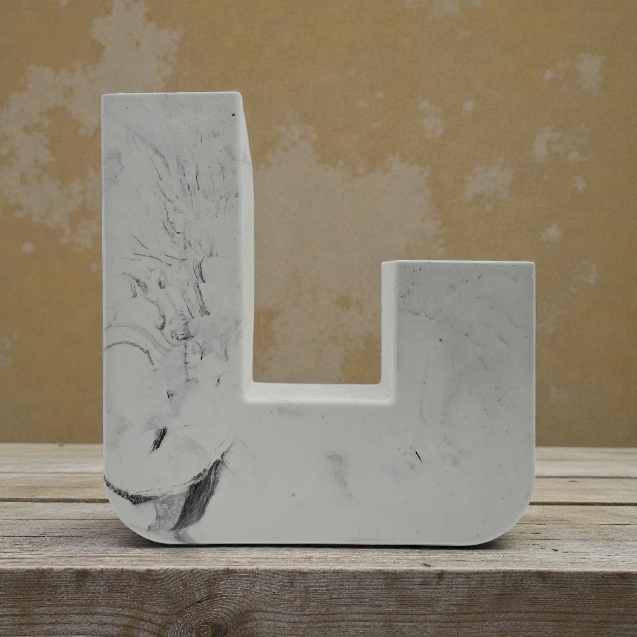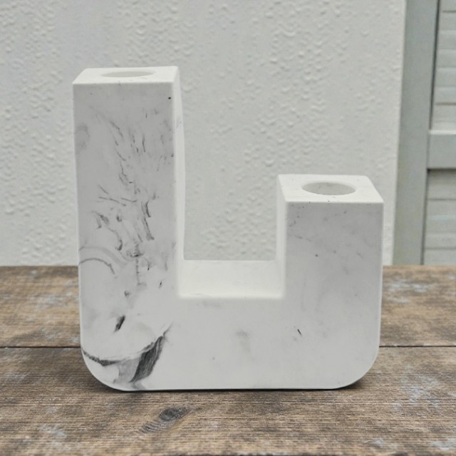 Denne moderne ''L-formede'' lysholderen i marmorert design gir et uttrykk for stilrent dekor med karakter. Den arkitektoniske formen gir et stramt og sofistikert inntrykk, samtidig som de unike marmoreringene gjør hver lysholder helt unik.