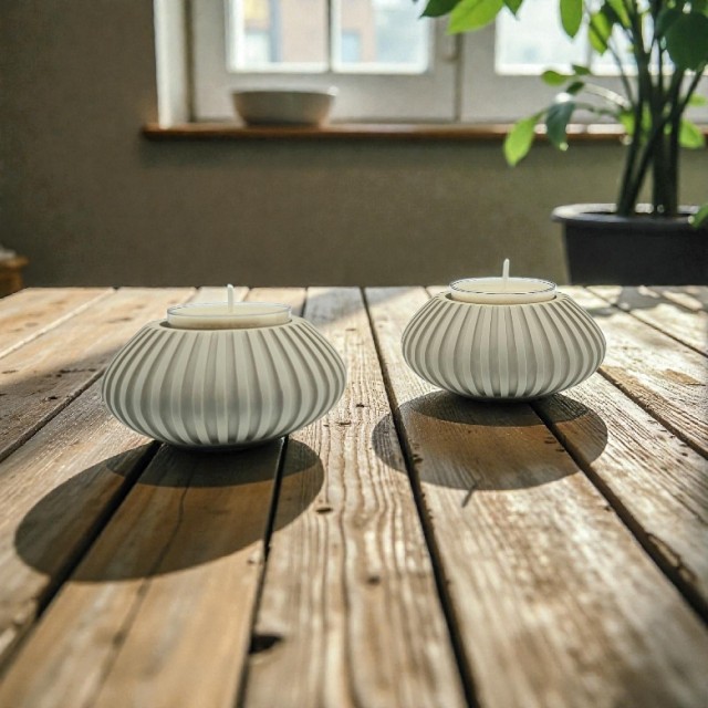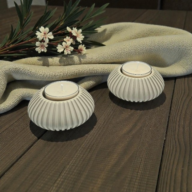 Disse elegante telysholderene kombinerer myke linjer med en harmonisk, rillet form som gir et rolig og stemningsfullt uttrykk. Det lave, avrundede designet lar lyst spre seg varmt og behagelig, samtidig som den strukturerte overflaten skaper et vakkert spill av skygger når flammen er tent.