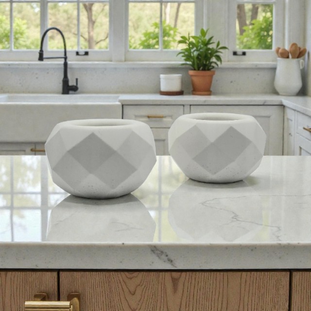 Dette elegante settet med to telysholdere kombinerer et moderne, fasettert design med et mykt, tidløst uttrykk. Den matte, hvite overflaten gir et eksklusivt og minimalistisk preg som passer perfekt inn i både moderne og skandinaviske interiører. Like fine alene som sammen - ideelle på spisebordet, i vinduskarmen eller som del av en dekorativ oppstilling.