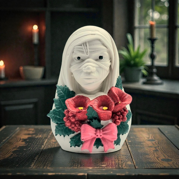 Denne dekorfiguren formidler stillhet, ettertanke og indre styrke gjennom sitt detaljerte og symbolske uttrykk. Det rolige ansiktet, delvis skjult bak bandasjelignende former, skaper en følelse av beskyttelse og sårbarhet - som et øyeblikk av pause midt i det som har vært.