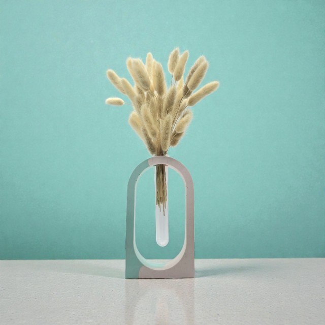 Vasen er laget i en lett og solid støpemasse med et integrert plastrør i midten - ideelt for en enkelt blomst eller noen strå. Det transparente røret skaper en luftig kontrast til den fargede rammen, og gir en kunstnerisk balanse mellom funksjon og design.