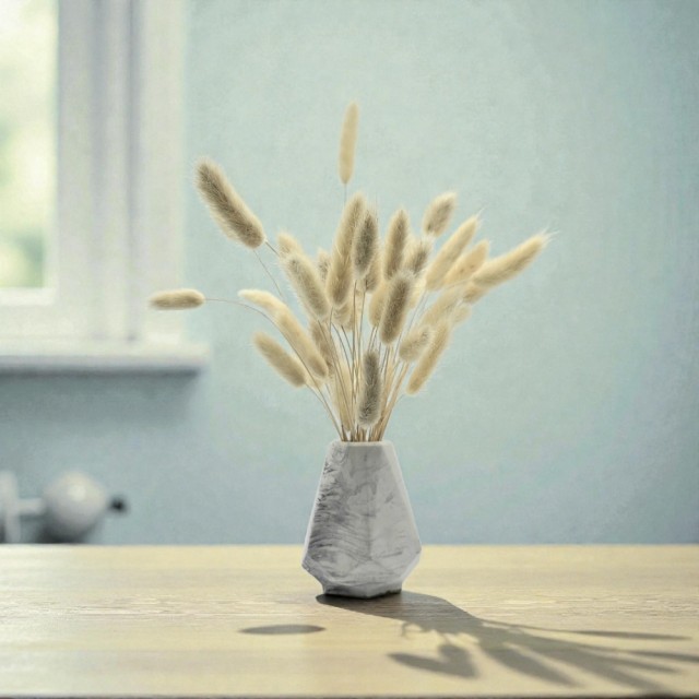 Denne mini vasen kombinerer skulpturell form me et mykt, marmorinspirert uttrykk. Den fasetterte silhuetten gir et moderne preg, men de lyse nyanseneskaper en tidløs og harmonisk helhet. Perfekt til tørkede strå, små blomster eller som et dekorobjekt alene.